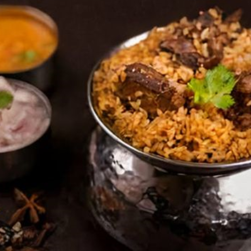 Organic chicken marinated in spices, yogurt, zafran and cooked on dum for maximum flavor.
