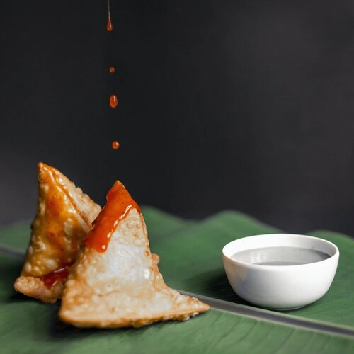 Indian Taco’s - Roti wrapped with Chicken 65, Onion, mint chutney, lemon, chat masala.